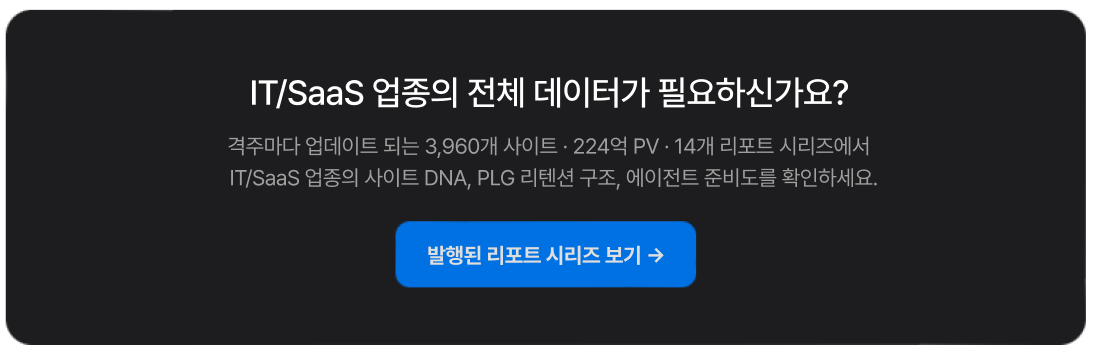 이것이 의미하는 바: IT/SaaS 사이트의 핵심 전장은 “로그인 전(Pre-Login)”과 “로그인 후(Post-Login)” 사이의 전환입니다. 프리미엄(Freemium) 모델에서 무료 사용자가 유료로 전환하는 순간, 로그인 빈도가 높은 사용자가 유지되는 구조 — 이 모든 것이 로그인 경험의 품질에 달려 있습니다.