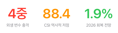 소비자심리지수(CSI)가 100.7에서 88.4로 폭락했습니다. 이것은 단순한 숫자가 아닙니다. 소비자의 구매 의사결정 전체가 ‘보류 모드’에 들어갔다는 의미입니다. 이 시기에 수집된 모든 행동 데이터에는 ‘공포에 의한 보류’라는 보이지 않는 필터가 적용되어 있습니다.