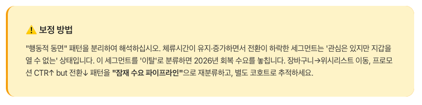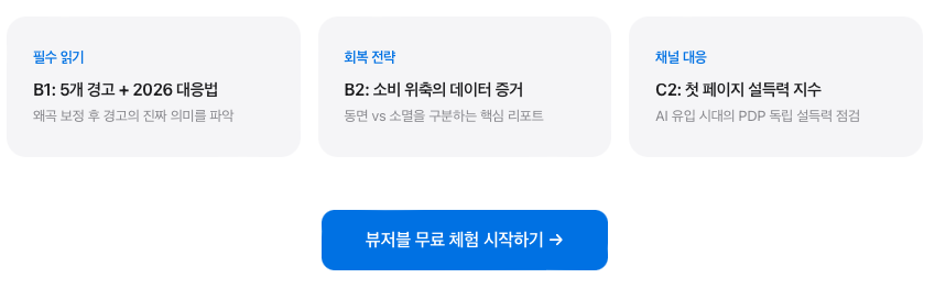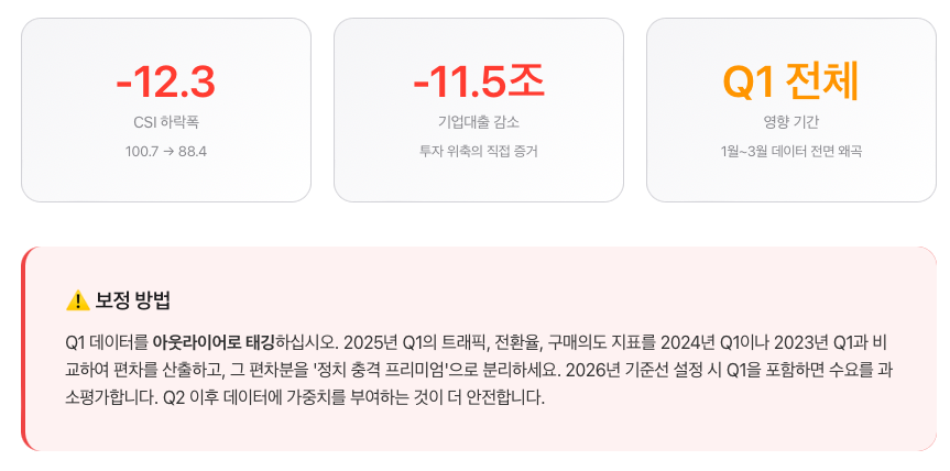 이 왜곡이 백서 시리즈에 미치는 영향: B1 리포트의 5개 경고 중 ‘트래픽 양극화’와 ‘구매의도 하락’은 이 정치 충격의 직접적 결과입니다. B2 리포트의 ‘소비 위축 증거’ 역시 이 맥락에서 읽어야 합니다. 위축의 상당 부분은 구조적 변화가 아니라 일시적 충격에 의한 것입니다.