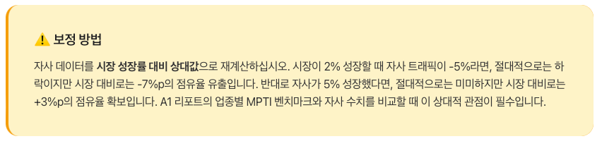 한국 이커머스 시장 성장률이 ~2%로 둔화되었습니다. 5~10% 성장이 기본이던 시기와 2% 정체기에서는 같은 데이터가 전혀 다른 의미를 가집니다. 성장기에 트래픽 -10%는 경고지만, 정체기에 트래픽 -10%는 시장 점유율 이동의 신호일 수 있습니다.