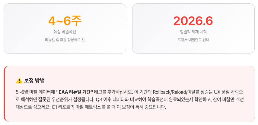 2025년 6월 유럽 접근성법(EAA) 시행에 맞춰 많은 기업이 Q2에 접근성 오버레이 UI를 도입하거나 사이트를 리뉴얼했습니다. 이 과정에서 뒤로가기(Rollback), 새로고침(Reload), 이탈률이 인위적으로 급증했습니다. 이것은 사이트가 나빠진 것이 아니라, 사용자가 새로운 인터페이스에 적응 중인 학습곡선입니다.
