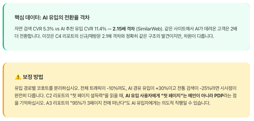 네이버 AI 탭이 검색 유입의 20%를 경유하기 시작했습니다. Gartner는 2026년까지 전통 검색 유입이 25% 감소할 것으로 예측합니다. 이것은 트래픽이 사라진 것이 아니라 경로가 바뀐 것입니다. AI 추천으로 유입된 사용자는 메인 페이지를 건너뛰고 PDP(상세 페이지)에 직접 도착합니다. 이로 인해 메인 페이지 트래픽 감소, 바운스율 변동, 페이지당 체류시간 변화 등이 나타나지만, 이것이 반드시 부정적 신호는 아닙니다.