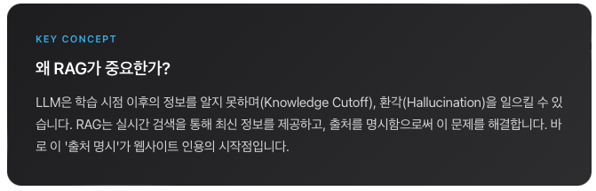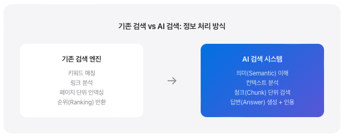 이러한 차이의 핵심에는 RAG(Retrieval-Augmented Generation) 아키텍처가 있습니다. RAG는 LLM(Large Language Model)이 외부 정보를 실시간으로 검색하고 활용하여 답변을 생성하는 방식으로, 현대 AI 검색의 표준이 되었습니다.