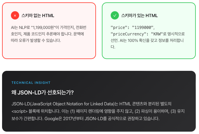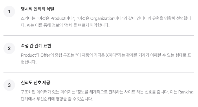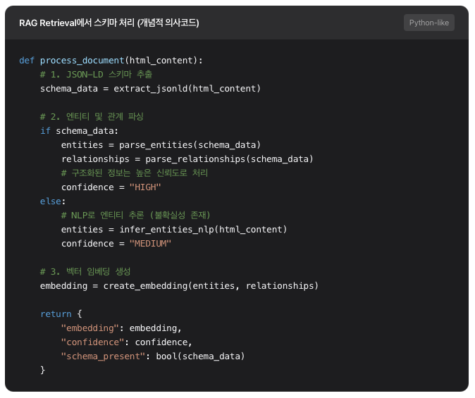 RAG의 Retrieval 단계에서 시스템은 웹 문서를 ‘청크(Chunk)’ 단위로 분할하고, 각 청크의 의미를 벡터로 임베딩하여 검색합니다. 이때 구조화된 데이터(Schema)는 다음과 같은 이점을 제공합니다:
