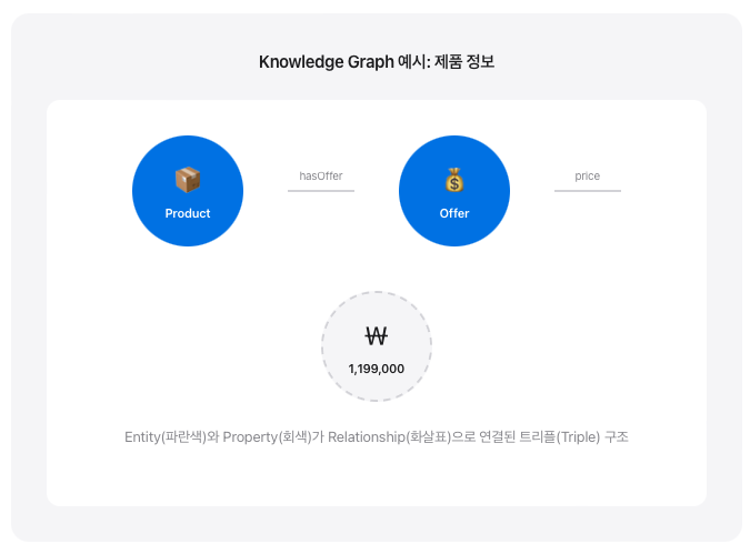 AI 시스템이 정보를 ‘이해’한다는 것은 결국 Knowledge Graph 형태로 정보를 표현한다는 것을 의미합니다. Knowledge Graph는 엔티티(Entity)와 관계(Relationship)의 네트워크로, 웹의 정보를 기계가 이해할 수 있는 형태로 구조화합니다.
