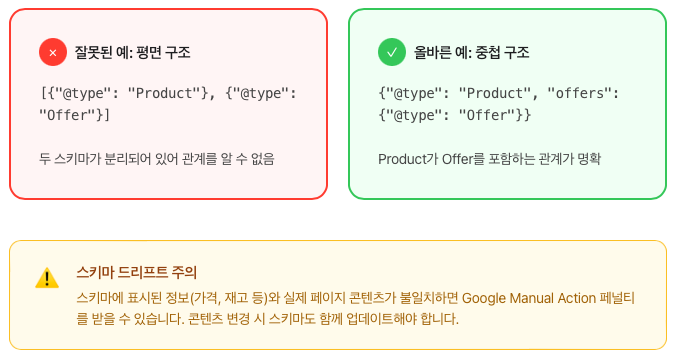 스키마의 진정한 힘은 중첩 구조에서 나옵니다. 단순히 정보를 나열하는 것이 아니라, 정보 간의 관계를 표현해야 AI가 올바르게 이해합니다.