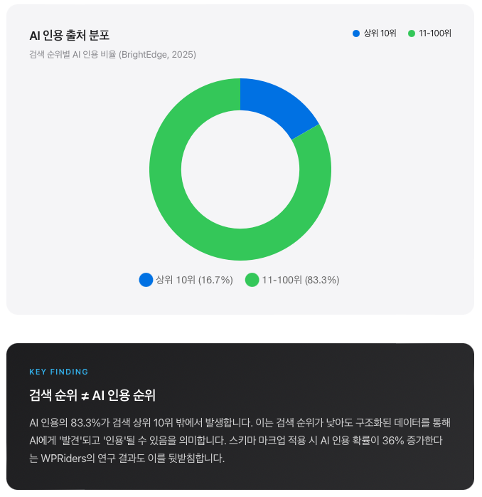 스키마 마크업은 단순한 SEO 도구가 아닙니다. 이는 AI와 소통하는 공용어(Lingua Franca)입니다. 검색 순위 50위 밖의 페이지도 올바른 스키마를 갖추면 AI의 답변에 인용될 수 있습니다. BrightEdge 연구가 보여주듯, AI 인용의 83.3%는 검색 상위권 밖에서 발생합니다.
