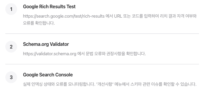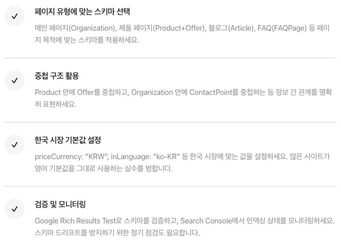 지금 당장 할 수 있는 것: 페이지 유형에 맞는 스키마를 선택하고, 중첩 구조로 관계를 표현하며, 한국 시장에 맞는 기본값을 설정하세요. 그리고 정기적으로 스키마와 실제 콘텐츠의 일치 여부를 검증하세요.