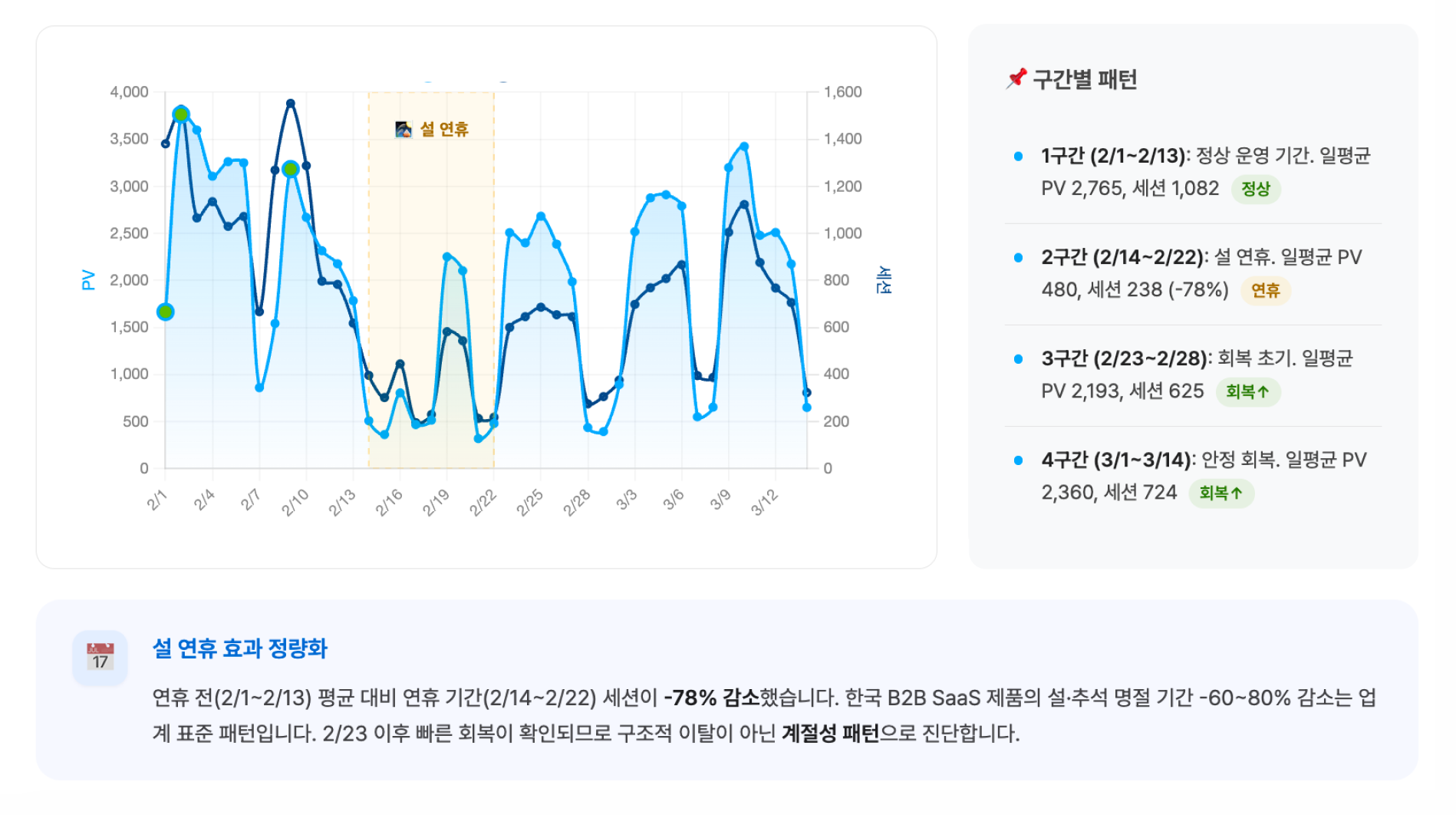 먼저, 트래픽 급감의 주요 원인은 설 연휴라는 점을 확인할 수 있었습니다. AI 커스텀 대시보드는 데이터 분석 기간을 정상, 연휴, 회복의 세 단계로 구분합니다. 트래픽 감소 현상을 구조적인 문제가 아니라 계절성 패턴으로 해석한 것입니다.