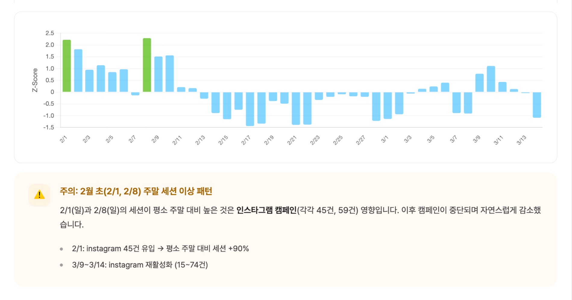 AI 커스텀 대시보드는 B2B 서비스인 뷰저블의 주말 트래픽이 비정상적으로 급증한 기간을 ‘해석이 필요한 구간’으로 정의합니다. 이를 바탕으로 2월 1~2주 차 주말의 세션 증가가 인스타그램 캠페인에 따른 긍정적 변화라는 사실을 짚어냈죠.