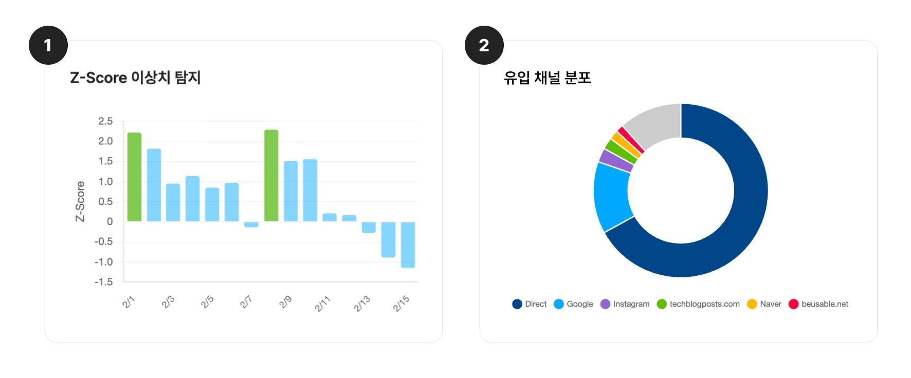 예를 들어, 이상치 탐지가 필요한 세션 데이터의 경우 ❶ Z-Score 변환을 적용합니다. 이를 통해 평균에서 얼마나 벗어난 값인지를 시각적으로 드러내며, 패턴을 빠르고 명확하게 파악할 수 있습니다. 유입 채널처럼 항목 간 구성 비율이 중요한 데이터에는 ❷ 도넛 차트를 활용합니다.