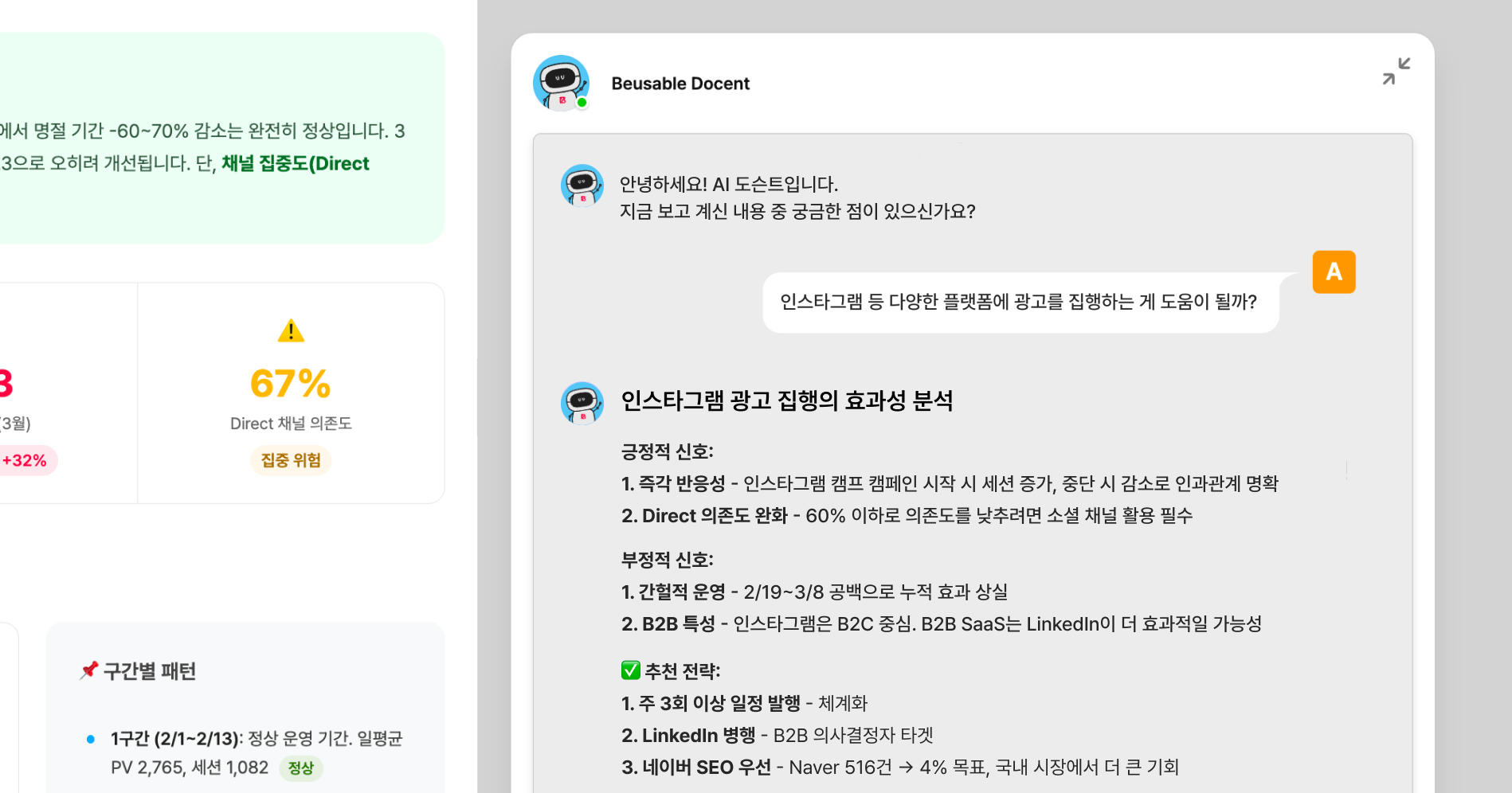 가령 인스타그램 캠페인이 세션 트래픽에 긍정적인 영향을 미칠지 궁금하다면, 도슨트에게 “인스타그램에 광고를 집행하는 것이 도움이 될까?”라는 질문을 던질 수 있습니다. 도슨트는 질문과 관련된 데이터를 기반으로 광고 집행의 장단점과 기대 효과를 정리하죠.
