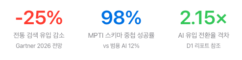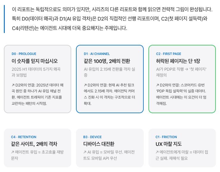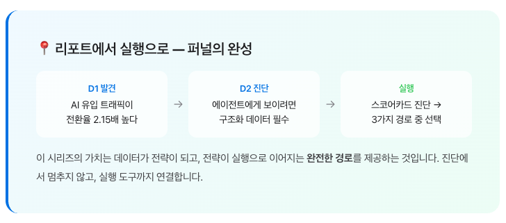 이 리포트는 다른 시리즈와 성격이 다릅니다. A~C 시리즈가 ‘현재 사용자의 행동’을 분석하고, D0이 ‘2025 데이터의 왜곡’을, D1이 ‘AI 유입 채널의 전환율 격차’를 다뤘다면, 이 리포트는 12~24개월 뒤에 웹사이트에 무슨 일이 일어날 것인지를 다룹니다.