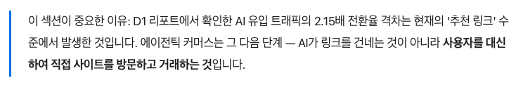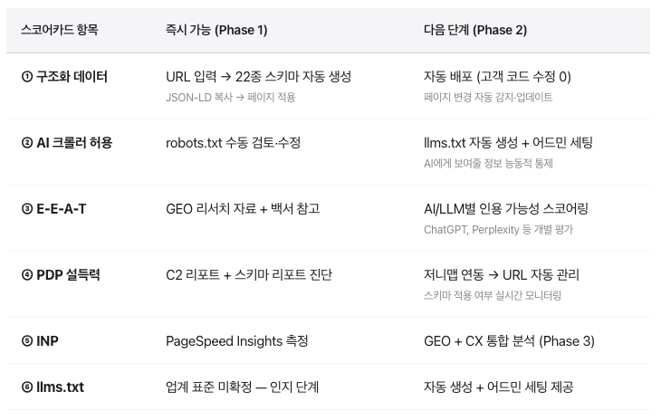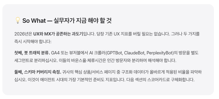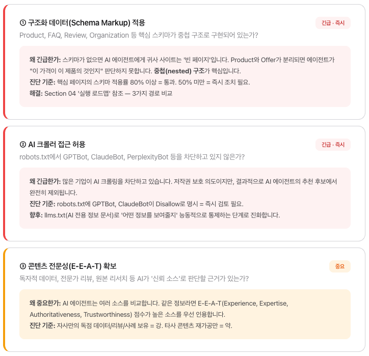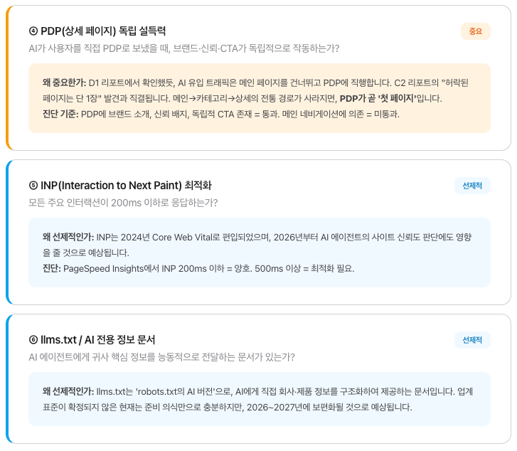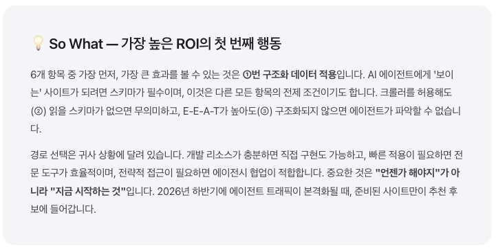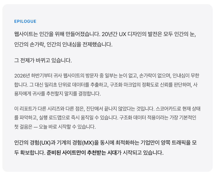 2026년 하반기부터 웹사이트의 ‘방문자’ 중 상당수는 인간이 아닌 AI 에이전트가 됩니다. 이 변화에 대비하지 않는 사이트는 가장 전환율이 높은 트래픽 소스를 놓치게 됩니다. 그리고 이 리포트는 진단에서 끝나지 않습니다. 즉시 실행 가능한 경로까지 제시합니다.