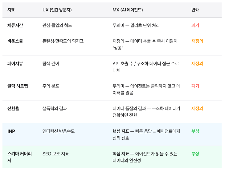 에이전트는 눈이 없고, 시간 개념이 없으며, 밀리초 단위로 데이터를 추출합니다. 이 사실이 웹사이트 분석의 모든 전제를 바꿉니다. 기존 지표 하나하나를 MX 관점에서 재검토해야 합니다.