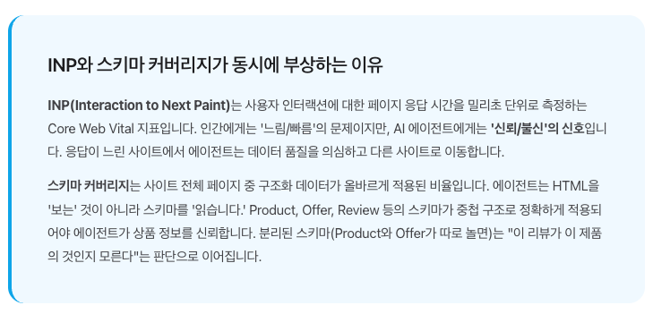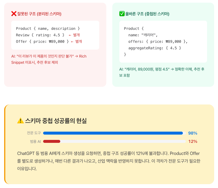 스코어카드 ①번은 에이전트 준비도의 가장 기본적인 요건이면서, 동시에 가장 기술적으로 까다로운 항목입니다. 단순히 스키마를 ‘생성하는 것’이 아니라 ‘올바르게 중첩하는 것’이 핵심이기 때문입니다.