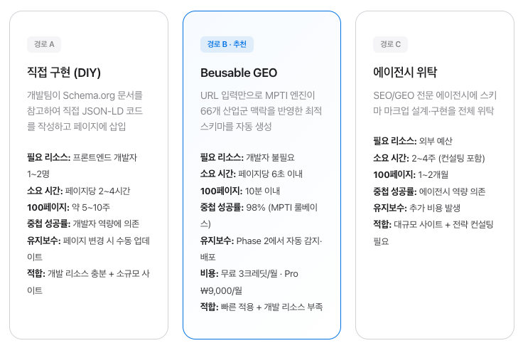 스키마 마크업 적용에는 크게 세 가지 접근이 있습니다. 귀사의 개발 리소스, 시간, 예산에 따라 최적 경로가 다릅니다.