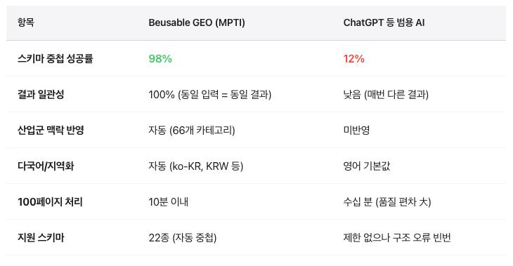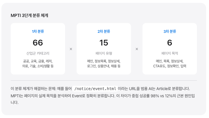 범용 AI와 전문 도구의 가장 큰 차이는 산업 맥락 반영 능력입니다. 같은 ‘상품 페이지’라도 이커머스, 의료, 금융에서 필요한 스키마 조합이 다릅니다. MPTI(Main Page Type Indicator)는 이 문제를 해결하기 위해 설계된 분류 체계입니다.