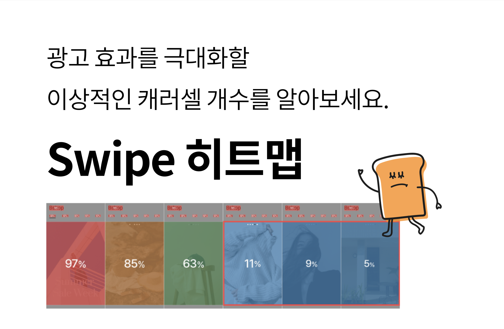 [뷰저블 기능 소개서] 뷰저블은 누구나 UX데이터를 분석하도록 시각화된 기능을 제공하는 서비스입니다.본격 글에 들어가기 앞서, 뷰저블 서비스가 궁금하신 분들은 https://forum.beusable.net/ko/post/811를 클릭해주세요. 메인 페이지의 캐러셀 개수를 결정하기 어려우신가요? 뷰저블의 모바일 Swipe 히트맵으로 광고 효과를 극대화할 이상적인