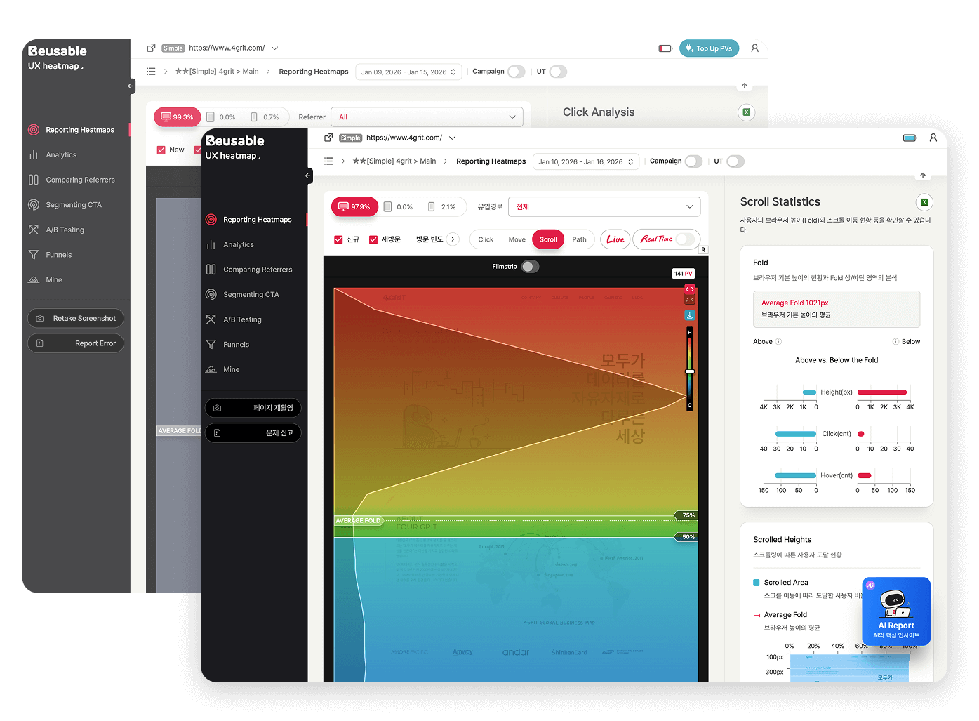 Beusable Heatmap/Journey Map helped us validate designs with real user behavior data and build a convincing case for design decisions. Tracking click rates and user responses on key pages gives us meaningful insights for CTA placement, and the Scroll AI Report quickly identifies reach rates and drop-off points—significantly cutting analysis time.