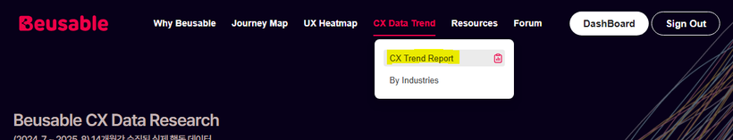 1. 뷰저블 홈페이지의 CX Data Trend > Report 페이지 방문https://www.beusable.net/ko/cxdata/report 2. Desktop-좌측하단, Mobile-하단에 팝업되는 서베이 참여 시작 3. 접수 완료 시 확인되는 팝업 ※ 서베이가 확인되지 않거나, 관련 문의가